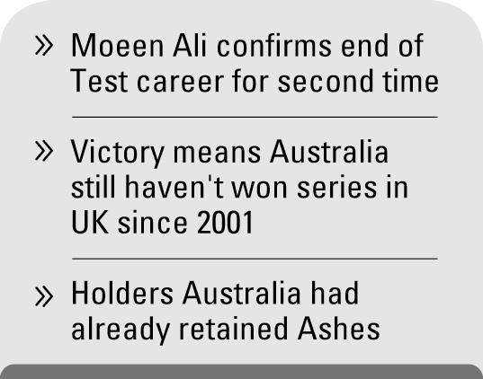 England win by 49 runs to ensure the series finishes all square at 2-2 and deny Australia a first away Ashes series win since 2001. Australia, as the holders, had already retained the Ashes but they remain without an Ashes series win in England since 2001.
