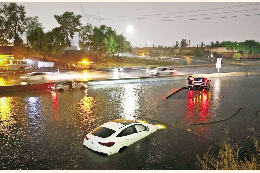 Cars are seen submerged in floodwaters on the Golden State Freeway in Sun Valley, California, US, on Monday as tropical storm Hilary moves through the area. Southern California is under a first-ever tropical storm warning as Hilary impacts parts of California, Arizona and Nevada. All California state beaches have been closed in San Diego and Orange counties in preparation for the impacts from the storm which was downgraded from hurricane status. — AFP