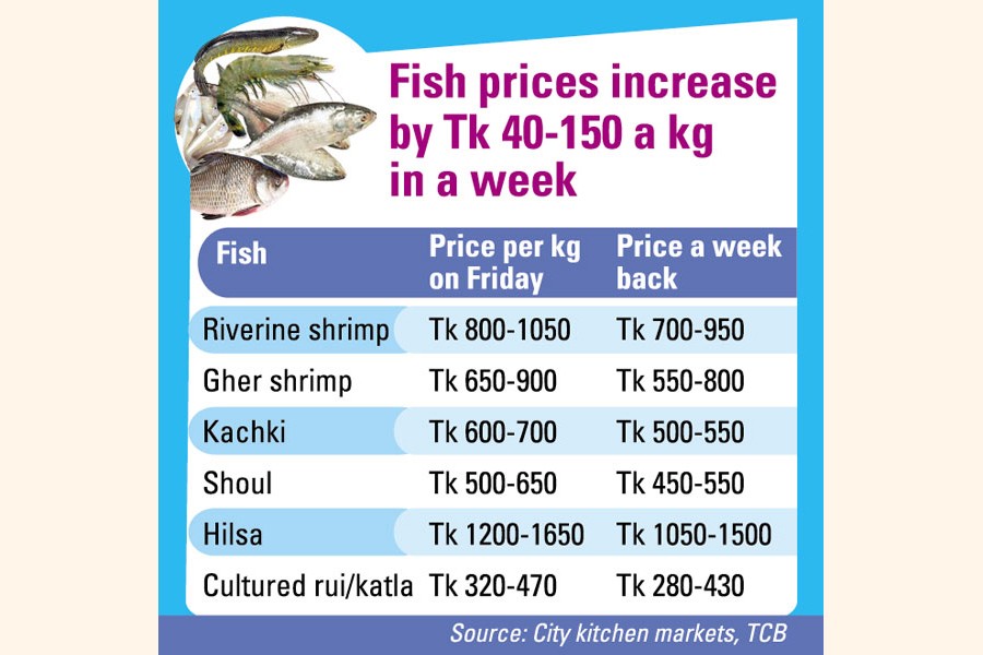 Prices of most of fish species showed a notable hike as both river and cultured fishes got pricier by Tk 40 to Tk 150 per kg in the last seven days, according to kitchen market traders.