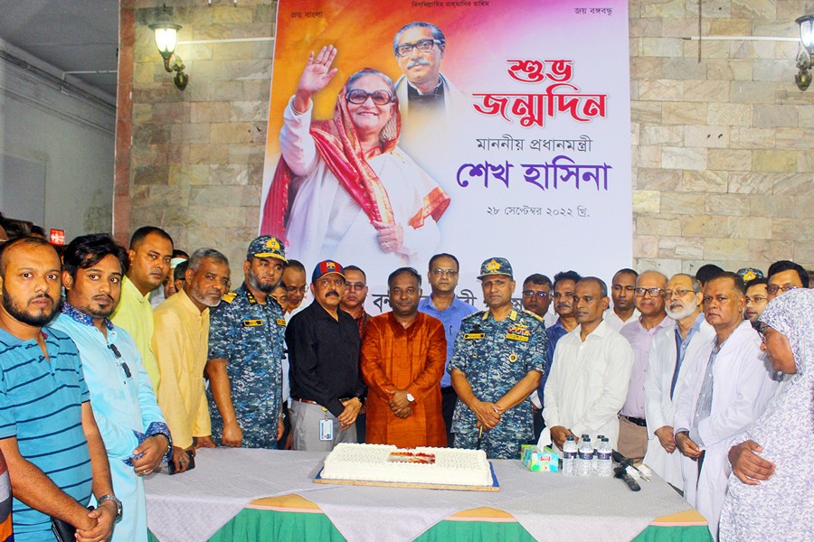 Chairman of Chittagong Port Authority Rear Admiral M Shahjahan cuts a cake at the port in Chattogram on Wednesday, marking the 76th birthday of Prime Minister Sheikh Hasina. Member of CPA Jafar Alam, President of Chittagong Port Workers Association (CBA) M Azim and General Secretary Naevbul Islam, among others, were present on the occasion