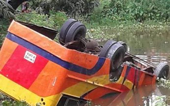 Two children have been killed and 35 more injured when a bus fell into a pond at Narayanganj’s Araihazar. The incident took place at Satgram Union’s Purinda at 9pm on Monday. The children who died are 6-month old ‘Nasima’ from Mithain and 2-year old ‘Shahin’ from Kishoreganj’s Ashtagram. ‘The driver of the bus headed for Bhairab lost control and the vehicle crashed into a pond,’ said Araihazar Police OC Md Alauddin quoting witnesses. Locals rushed to recover the dead bodies of the children and took the injured passengers to nearby hospitals, he said, according to bdnews24.com.