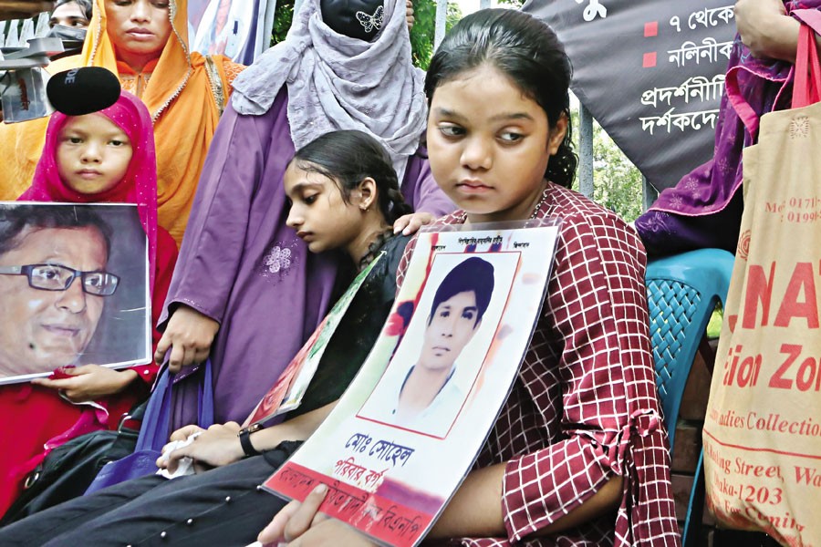 Children holding photos of their loved ones who were victims of ‘enforced disappearances’ at a human chain programme organised under the banner of ‘Mayer Dak’ in front of the National Museum in the city on Tuesday, marking the International Day of the Victims of Enforced Disappearances — FE photo