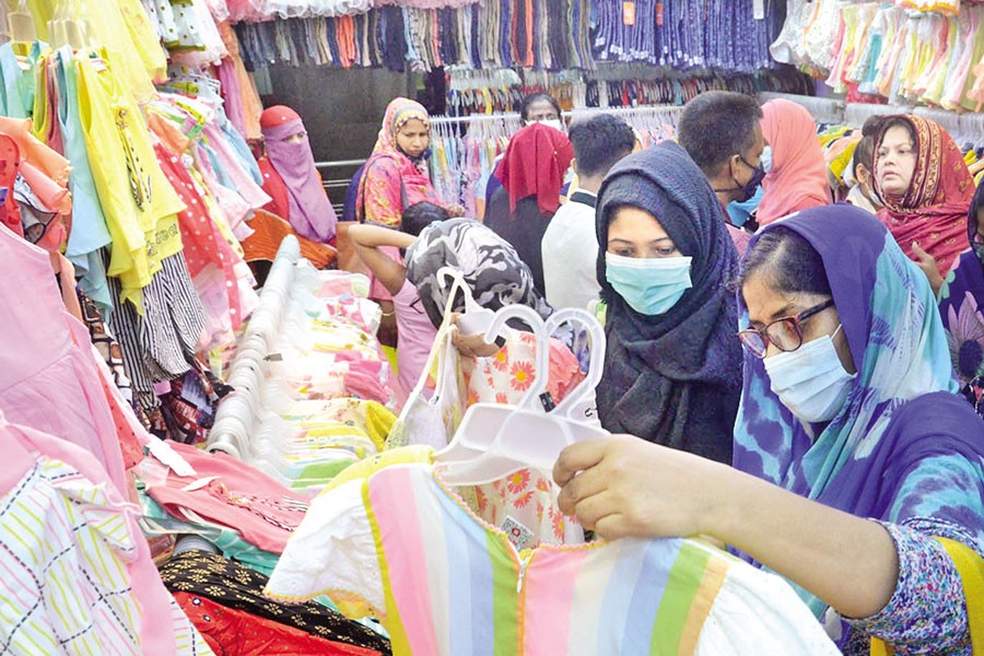 With Eid-ul-Fitr only days away, clothing stores in Dhaka are abuzz with customers, but the owners are not fully happy as they bemoan that sales have not returned to the pre-pandemic level despite a sharp drop in coronavirus cases, reports bdnews24.com.