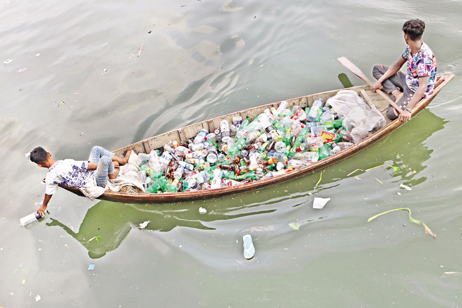 These two boys float in a boat on the Buriganga River while collecting plastic bottles that eventually ended up in the river. Selling those bottles means a livelihood for this section of people. The photo was taken near Sadarghat launch terminal in Dhaka recently — FE photo