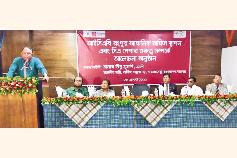 Commerce Minister Tipu Munshi inaugurated the Rangpur regional office of the Institute of Chartered Accountants of Bangladesh (ICAB) on Sunday. ICAB President Md Shahadat Hossain FCA, Vice President Fouzia Haque FCA, Council Member Md Moniruzzaman FCA, and CEO Shubhasish Bose, among others, were present on the occasion. ICAB expects students of different universities and colleges in Rangpur region will get the edge of opening the ICAB regional office for getting admission into CA education and can use the academic and examination facilities.