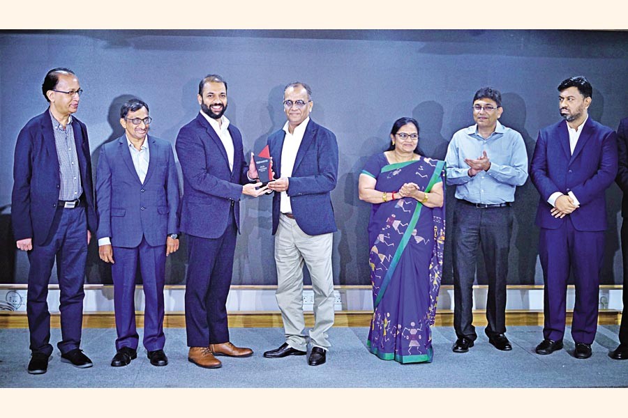 Community Bank Bangladesh has won INFOSYS-Finacle Innovation Award 2023 in three categories -- two Platinum awards in 'ESG-Led Innovation' and 'Process Innovation' categories and a gold award in 'Product Innovation' category. Aditya Singaraju, Country Director, Infosys-Finacle Bangladesh, and Reghunathan Sukumara Pillai, Head of Business Consulting Group, Infosys Finacle South Asia, presented the awards to Masihul Huq Chowdhury, Managing Director and CEO of Community Bank, at the Head Office of the bank on Wednesday.