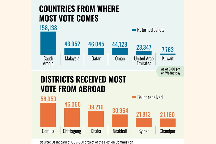 Among the districts, Comilla received the highest number of overseas ballots at 58,953, followed by Chittagong (46,060), Dhaka (39,216), Noakhali (30,964), Sylhet (21,813) and Chandpur (21,160).