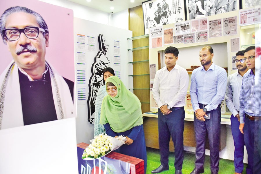 Controller General of Defence Finance (CGDF) Monowara Habib pays homage to Father of the Nation Bangabandhu Sheikh Mujibur Rahman by placing a wreath at his portrait on the CGDF premises in the city on Monday, marking the 47th martyrdom anniversary of Bangabandhu and National Mourning Day — ISPR