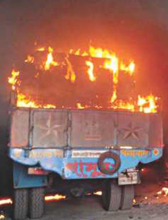 Suspected Jamaat-Shibir activists, equipped with brick chips and sticks, swooped on passing vehicles on Comilla-Sylhet highway in Debidar Upazila in Comilla district a couple of hours before the 1st phase of 2-day nationwide hartal started on Thursday. They damaged a bus and torched a truck during the attacks. They took out small processions from different areas of Debidar and gathered on the highway in Barura area. Chanting slogans in favour of hartal, the suspected Jamaat-Shibir men hurled brick chips at a bus and attacked the passing vehicle with sticks, leaving it damaged. A few minutes later, they forcibly stopped a cotton-laden truck and torched it. Being informed a firefighting unit from Companiganj Fire Station rushed to the spot and tamed the blaze. Police, Firefighters and the driver of the truck claimed that the extent of loss caused by the fire will be around Tk 2 million (Tk 20-lakh), according to a news agency.