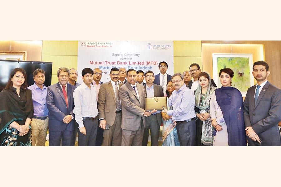 Country Director of Marie Stopes Bangladesh Masrurul Islam, FCA, and Deputy Managing Director & Chief Business Officer of Mutual Trust Bank Ltd. (MTB) Syed Rafiqul Haq exchanging documents after signing an agreement on providing nationwide bill collection services at MTB Centre in the capital recently