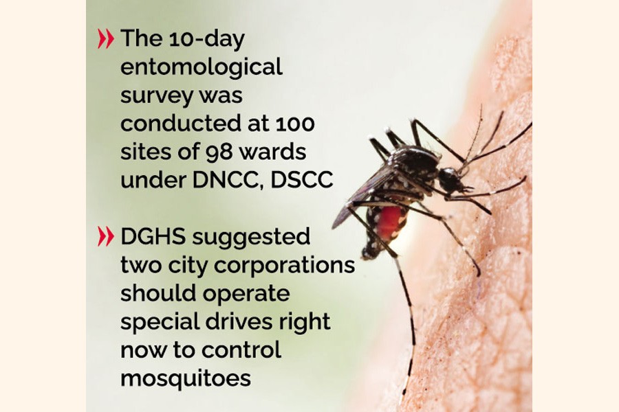 National Malaria Elimination and Aedes Transmission Disease Control Programme of DGHS has found the dire situation in a recent survey. The 10-day entomological survey was conducted at 100 sites of 98 wards under Dhaka North City Corporation (DNCC) and Dhaka South City Corporation (DSCC).