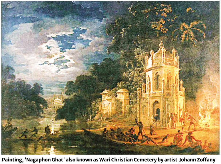 Artists like Sir Charles D'Oyly and Johann Zoffany often painted ruins and fading Mughal monuments, presenting Dhaka as a place that had outlived its glory. They focused more on the water sides of Dhaka, such as the bank of the Buriganga River or the canal beside the Wari Christian cemetery, built in 1600.