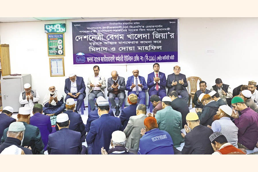 Janata Bank Jatiyatabadi Karmachari Union held a doa mahfil at the bank's head office on Thursday to pray for salvation of the departed soul of former prime minister and BNP Chairperson Begum Khaleda Zia. Chairman of the bank Md Fazlur Rahman; Director Md Obaidul Haque; Managing Director Md Mazibur Rahman; and DMDs Md Faiz Alam and Qazi Abdur Rahman attended the event. Jatiyatabadi Sramik Dal president Anwar Hossain and Joint General Secretary Mostafizul Karim Majumder, along with Janata Bank Jatiyatabadi Karmachari Union President Md Rafiqul Islam and General Secretary Md Ilias Khan, and other officials and employees were also present.