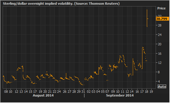 The US dollar is stronger, Treasury prices weaker, while US and European equity benchmarks are firmer as investors absorb the Federal Reserve’s latest policy update. Sterling is up 42 pips to $1.6312 as voting gets under way in the referendum over whether Scotland will leave the UK. The pound’s overnight implied volatility gauge (see chart below), which over recent months has tended to trade between 4 and 8, has jumped to 30.8 as the poll outcome is too close to call. Industrial commodity prices are lower, reflecting concerns about ample supply and waning demand as China’s economic growth slows. US index futures show the S&P 500 climbing 5 points to 2006.5. The FTSE Eurofirst 300 is up 0.7 per cent and its Asia-Pacific peer is down 0.3 per cent as the two regions get their first chance to react to Wednesday’s Fed announcement. The US central bank left its main interest rate at record lows and reduced its monthly asset purchases by a further $10bn, to $15bn a month. The Fed repeated its pledge to keep interest rates low for a ‘considerable time’ but also hinted it could lift borrowing costs more quickly than expected in 2015 and 2016, according to ft.com