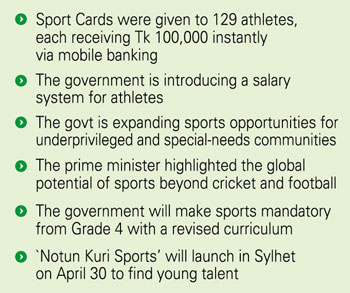 Before delivering his speech, the prime minister inaugurated the Sport Cards and allowance distribution programme. As he pressed a button on a laptop, Tk 100,000 was instantly transferred to each player's mobile phone through Sonali Bank's online system. At the event, he handed over Sport Cards to 129 sportsmen and also honoured those who achieved success at the international level.