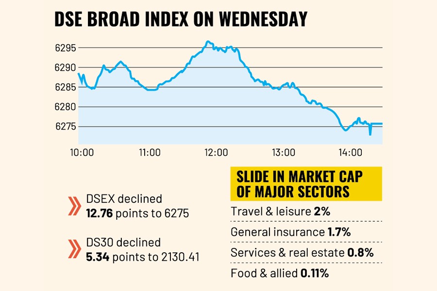At the end of the session, the DSEX settled at 6,275 points with a loss of 0.20 per cent or 12.76 points.