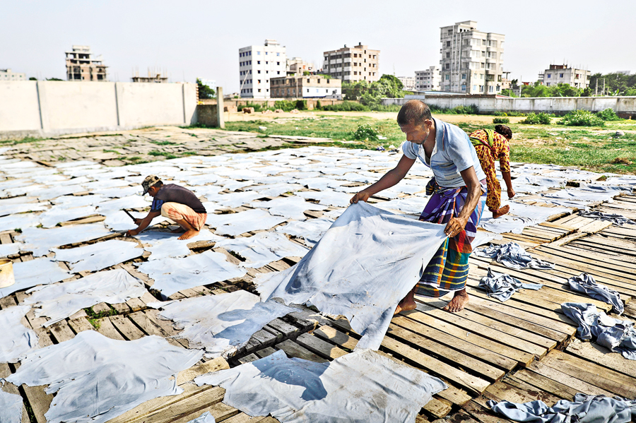 Earning a living: Traders spread hides of animals on a field in Hajaribagh area of the city in preparation for tanning on Saturday. They buy low-quality hides from the market at Posta and then process the hides before selling them to small local footwear makers. — FE Photo