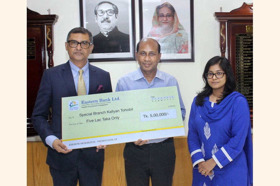 Ziaul Karim, Head of Communications and External Affairs of Eastern Bank Ltd. (EBL) handing over a cheque for Taka 0.5 million to Md. Monirul Islam, Additional IG of Bangladesh Police and Head of Special Branch, at the SB Head office in the city Sunday. The money was donated to SB kallyan Tohobil for providing scholarships to meritorious children of the Special Branch officials.