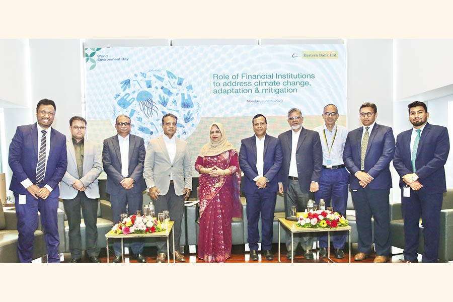 Eastern Bank Ltd (EBL) in observance of World Environment Day hosted a seminar on 'Role of Financial Institutions to Address Climate Change Adaptation & Mitigation' at the bank's head office in the capital on Monday. Nurun Nahar, Executive Director and Deputy Governor Designate, Bangladesh Bank; Dr. Fazle Rabbi Sadeque Ahmed, DMD, Environment and Climate Change, PKSF; Ali Reza Iftekhar, managing director and CEO of EBL; Chowdhury Liakat Ali, director (SFD), Bangladesh Bank; Dr. Shah Md. Ahsan Habib, professor (Selection Grade), BIBM; K.M. Rezaul Hasanat, chairman, Viyellatex Group; and M. Khurshed Alam, chairman, Sustainable Finance Committee, DMD & CRO of EBL, attended the seminar.