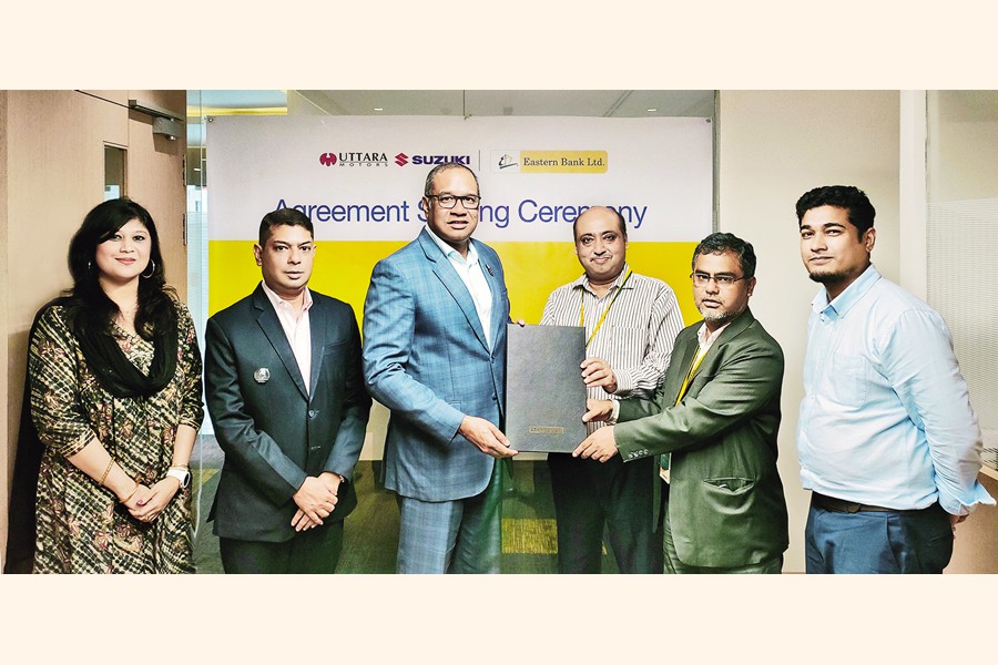 M Khorshed Anowar, deputy managing director and head of Retail and SME Banking of Eastern Bank Ltd (EBL), and Md Mahbub Alam, chief financial officer of Uttara Motors Ltd, exchanging documents after signing an agreement in Dhaka recently. Under the deal, EBL cardholders will enjoy a special discount on Suzuki brand cars distributed in Bangladesh by Uttara Motors.