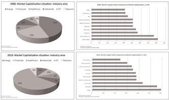 The figures in the Graphs show how market capitalization for the largest listed companies in world economy has changed its volume and dynamics from 2006 to 2016. Energy being the largest sector as volume has been replaced by IT sector in a significant manner. Apple, Alphabet, Amazon, Facebook which were not even in the list 10 years ago are now among the largest companies in terms of market capitalization. Having a cross-cutting industry presence, these companies' cumulative growth and total volume helped IT sector to capture the top position. I have collected the data from the Economist and prepared these comparative graphs to illustrate the analytical changes.