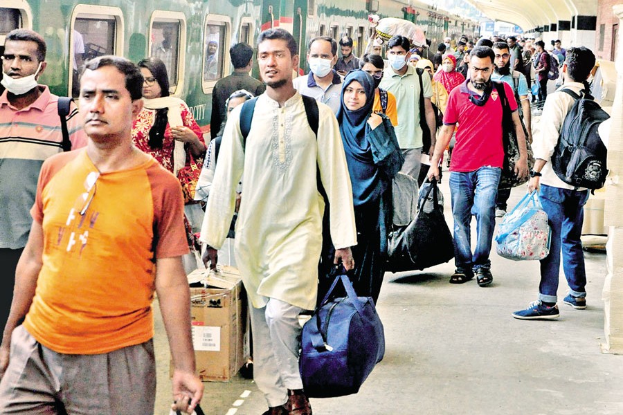 Eid home-goers on a platform at Kamalapur Railway Station in the city before boarding on trains for respective destinations on Friday — Focus Bangla