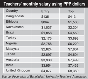 According to the federation leaders, entry-level university teachers in Bangladesh are paid $135 a month and professors $413 a month while in Ethiopia, it is $864 for entry level teachers and $1,580 for professors. In Kazakhstan, entry-level teachers get paid $1,037 and professors $2,304; in Turkey, $2,173 and $3,898; and in Brazil, $1,858 and $4,550. In Japan, entry-level teachers get $2,897 and professors $4,604; in Malaysia, $2,824 and $7,864; in Nigeria, $2,758 and $6,229; and in Australia, $3,930 and $7,499.In India, entry-level teachers get $3,954 and professors 7,433 and In the United Kingdom, $4,077 and $8,369. Teachers said that in pure salary comparison based on exchange rates, the highest salary would be in some western developed nations.