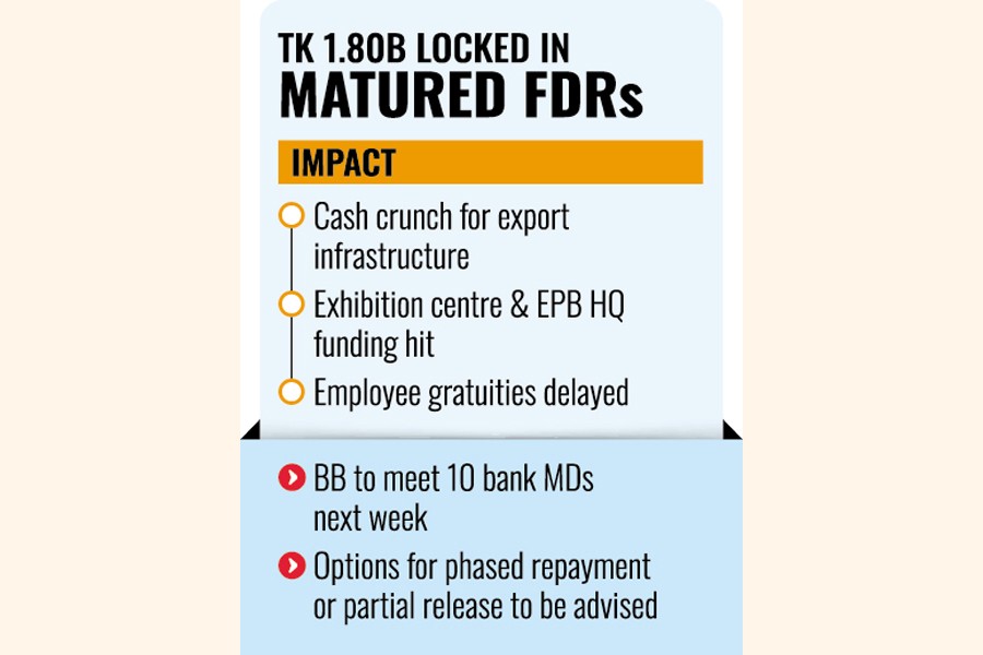 The Export Promotion Bureau (EPB) has turned to the government and the central bank for urgent help after nearly Tk 1.8 billion of its funds got trapped in fixed deposit receipts (FDRs) with 10 banks, raising concerns over stalled projects and mounting cash-flow stress.