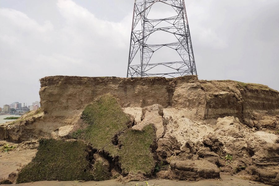 Erosion by the Meghna River threatens a tower of Sirajganj-Ashuganj national power grid. The photo was taken from Charsonarampur village in Ashuganj upazila of Brahmanbaria district on Monday — Focus Bangla