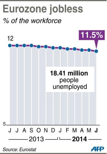 The jobless rate in the 18-nation eurozone fell to 11.5 per cent in June from 11.6 per cent in May, hitting the lowest level since September 2012, the Eurostat statistics agency said. Eurostat said there were 18.41 million people without a job in the euro single currency area in June, down 152,000 from May and 783,000 compared with June 2013 when the unemployment rate stood at 12 per cent. In the full 28-member European Union, the jobless rate improved to 10.2 per cent from 10.3 per cent, with 25 million people out of work, down 198,000 from May and 1.54 million from a year earlier when the rate was 10.9 per cent, it said. Austria had the lowest unemployment rate in June at 5.0 per cent, followed by Germany, the bloc's economic powerhouse on 5.1 per cent, while twice-bailed out Greece on 27.3 per cent and Spain, 24.5 per cent, topped the list again. In the highly sensitive category of under-25 unemployment, the eurozone came in at 23.1 per cent or 3.32 million, down from 23.9 per cent a year earlier. The EU was on 22 per cent or 5.13 million, compared with 23.6 per cent in June 2013, according to AFP.
