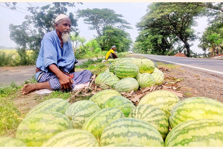 Farmers look dejected as they sell watermelon at low prices. The photo was taken from Boraigram upazila of Natore district on Tuesday — Focus Bangla