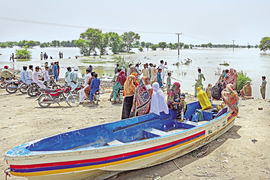 Flood-affected people gather on high ground in a flooded area of Burewala, a town of southern Punjab province of Pakistan, on Sunday. — AFP Photo