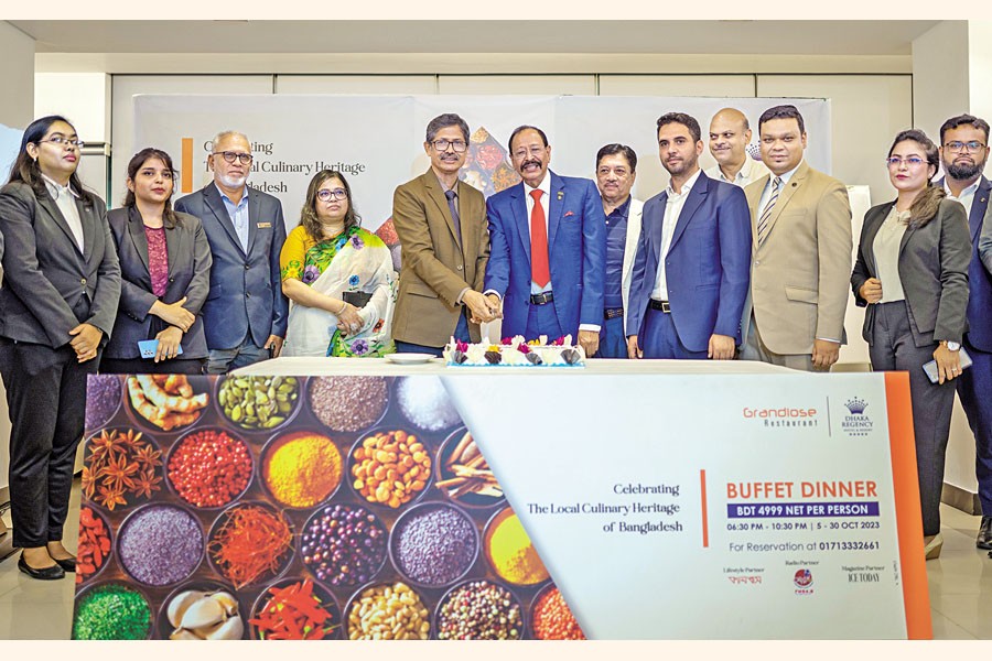 Dhaka Regency Hotel & Resort has organised a food festival titled 'The Local Culinary Heritage of Bangladesh 2023' that began on Thursday and will continue until October 30. The festival will showcase authentic local delicacies from all divisions of the country. Muhammad Abu Tahir Zaber, CEO, Bangladesh Tourism Board, and Shahid Hamid FIH, Executive Director of Dhaka Regency, inaugurated the event by cutting a cake. Kabir Reza, Managing Director of Dhaka Regency, was also present.