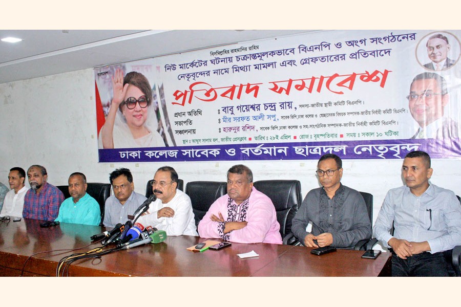 BNP standing committee member Gayeshwar Chandra Roy speaking at a protest meeting organised by the present and former leaders of Dhaka College unit Chhatra Dal at the National Press Club in the city on Thursday against filing false cases implicating their party men in the New Market mayhem — Focus Bangla