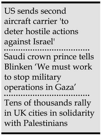 An AFP report adds: The United States is sending a second aircraft carrier strike group to the eastern Mediterranean "to deter hostile actions against Israel or any efforts toward widening this war following Hamas's attack," Secretary of Defence Lloyd Austin said Saturday.