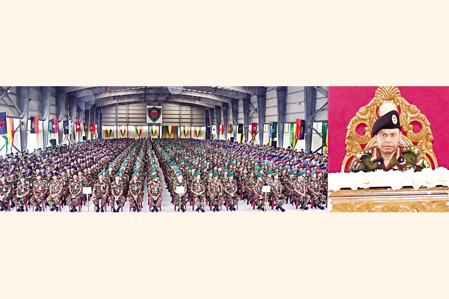Chief of Army Staff General SM Shafiuddin Ahmed addressing army personnel in Ramu Cantonment of Cox's Bazar on Monday — ISPR