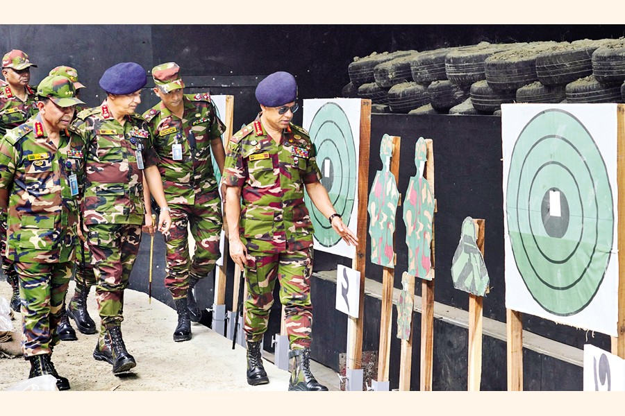 Chief of Army Staff General SM Shafiuddin Ahmed inspecting a newly-constructed indoor firing squad at Sheikh Russel Cantonment in Jajira, Shariatpur, on Wednesday — ISPR