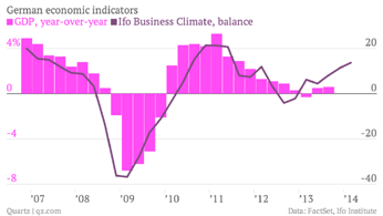 The German government remains optimistic in its outlook for Europe's biggest economy, despite negative growth in the second quarter, the weekly Der Spiegel reported Sunday. For the whole of 2014, the German economy could even notch up faster growth than the 1.8 per cent it is currently predicting, the magazine said, quoting Finance Minister Wolfgang Schaeuble. ‘Particularly thanks to domestic demand, there are chances that growth will be better than expected,’ according to an internal document from Schaeuble's ministry, Der Spiegel said. In official data released earlier this month, gross domestic product (GDP) contracted by 0.2 per cent in the second quarter, attributed to geopolitical tensions from the crises in Ukraine and the Middle East. The ministry conceded that those crises posed the biggest risk for the German economy going forward. Nevertheless, investment is rising and manufacturing orders are increasing. ‘All in all, the indicators point to a continuation of growth, particularly on the side of domestic demand,’ the finance ministry paper said, according to AFP.