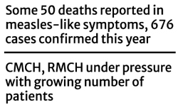 Professor Dr Shahida Yasmin, head of the paediatrics department at RMCH, said of the 30 children who died this year with measles-like symptoms, only one tested positive for the disease.