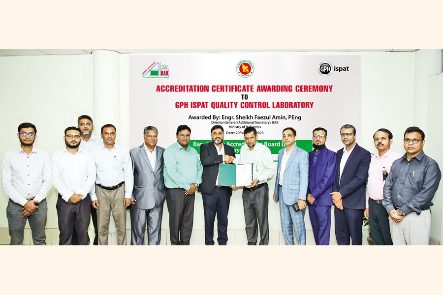 Bangladesh Accreditation Board (BAB) presented the accreditation certificate to GPH ispat Quality Control Lab, the first and only steel re-bar manufacturing company in Bangladesh. BAB Director General (Additional Secretary) Sheikh Faezul Amin handed over the certificate to GPH ispat Director Md. Ashrafuzzaman at the certificate handover ceremony organised by BAB recently. Chief Research and Project Officer of GPH Ispat ASM Suman, Head of Laboratory Saiful Islam and BAB officials were present at the ceremony.
