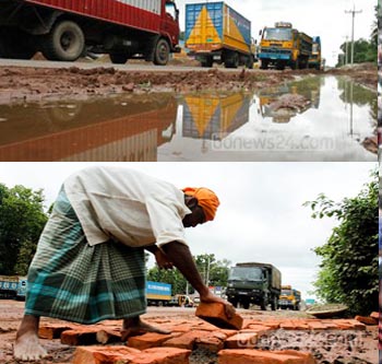 The highways still puts the moon to shame with gigantic craters despite the government hastily cobbling together a patchwork ahead of Eid-ul-Fitr, the greatest religious festival of the Muslims. Huge potholes, stripped face of the road, digging and pile of bricks and sand for construction have apparently made the would-be 4-lane highways look like a half-lane or 1-and-half-lane highway. Home-bound passengers are suffering untold miseries as the construction to widen the 2-lane highways into 4-lane ones has turned the roads almost into a rut. The rundown, narrow roads are causing massive congestions. Communications Minister Obaidul Quader on Monday, only a week before the Eid, claimed 80 per cent repairs of the country’s roads and highways were complete. But the people are far from reassured that the roads will be motorable and safe for ride; they also have their doubts about durability of the patchwork. They wonder if craters, which sprout up every year, would reappear within days of the road being repaired. The minister on July 11 had ordered patching up of all pothole-ridden roads and highways across Bangladesh within July 20. After his self-imposed deadline expired, Quader on Monday said it will take another ‘1 or 2 days’ to fix the rest of the badly damaged roads and highways ahead of Eid. But no marked improvements were seen during spot visits to several areas of Dhaka-Chittagong, Dhaka-Mymensingh, Dhaka-Sylhet and the highways linking the city with the southern, south-western and northern regions yesterday despite reconstructions. At some places, it looked like hell, according to a news agency.