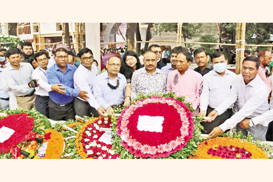 High officials and staff of Sonali Bank Limited placed a wreath at the graveyard of Bangamata Fazilatunnesa Mujib, wife of Father of the Nation Bangabandhu Sheikh Mujibur Rahman, at Banani graveyard on Monday on the occasion of the 92nd birth anniversary of Bangamata