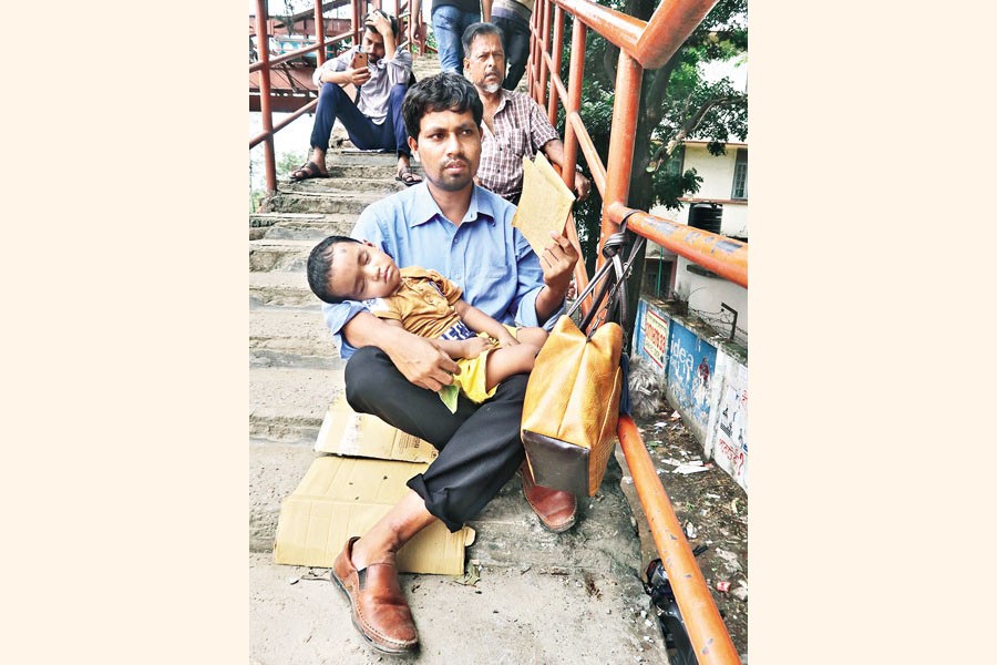 Holding his son on his lap, a man passes the time sitting on the stairs of a footbridge at Tejgaon in the city on Friday, as his wife sits for the BCS preliminary test at the nearby Dhaka Polytechnic Institute — FE photo by Shafiqul Alam