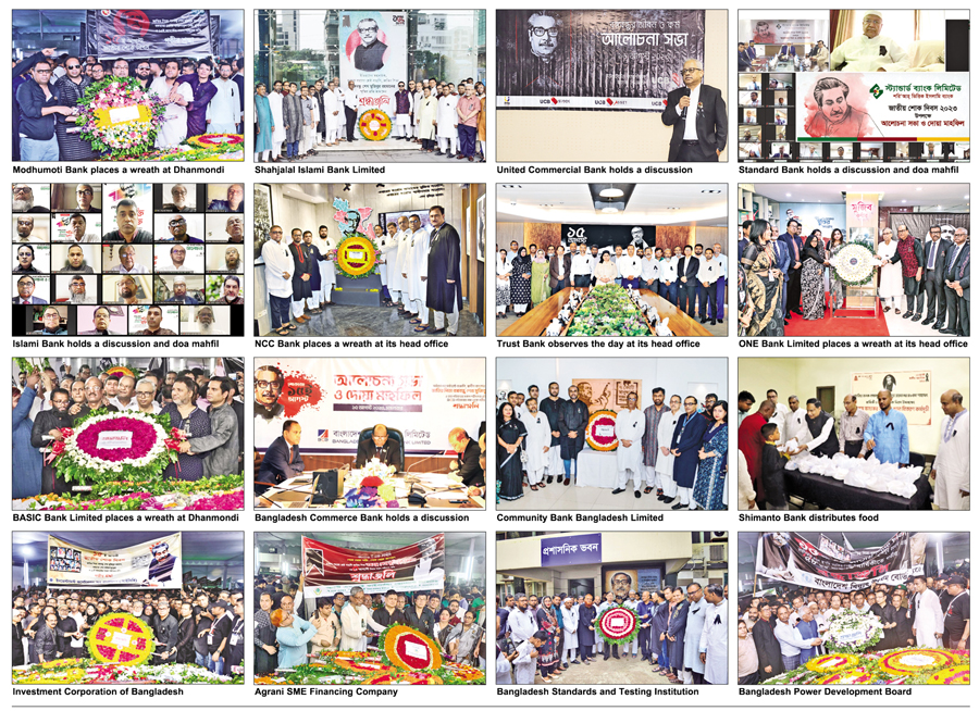 Different financial institutions, organisations and government agencies paid tribute to Father of the Nation Bangabandhu Sheikh Mujibur Rahman by placing wreaths at his portraits at Dhanmondi in Dhaka, at their head offices and other places across the country on Tuesday, marking the National Mourning Day.