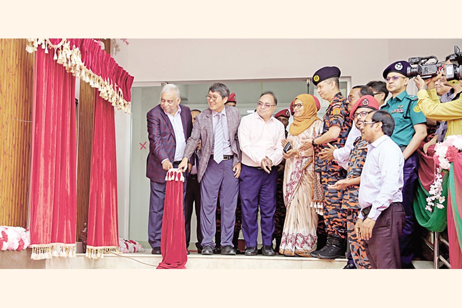 Home Minister Asaduzzaman Khan inaugurating the Emergency Response Control Centre (ERCC) building at Fire Service and Civil Defence (FSCD) Headquarters in the city on Wednesday. South Korean Ambassador to Bangladesh Park Young-sik, Korea International Cooperation Agency Country Director Taeyoung Kim, Security Services Division acting Secretary Md Saiful Islam, Additional Secretary (Fire wing) Shahnara Khatun and FSCD Director General Brigadier General Md Main Uddin are also seen.