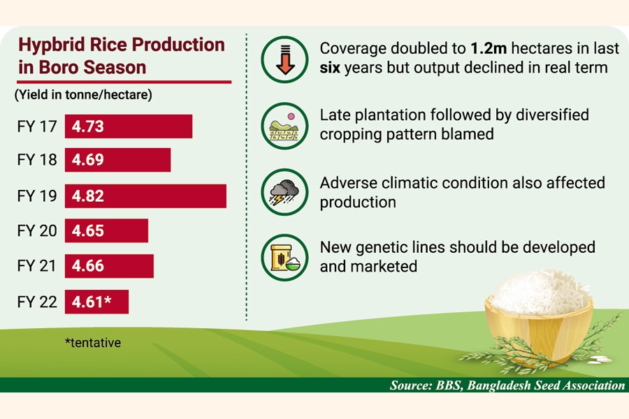 Although total Boro hybrid acreage increased to over 25 per cent, per-hectare yield (PHY) dropped to 4.65 tonnes in fiscal year (FY) 2021 from 4.82 in FY18, according to insiders.