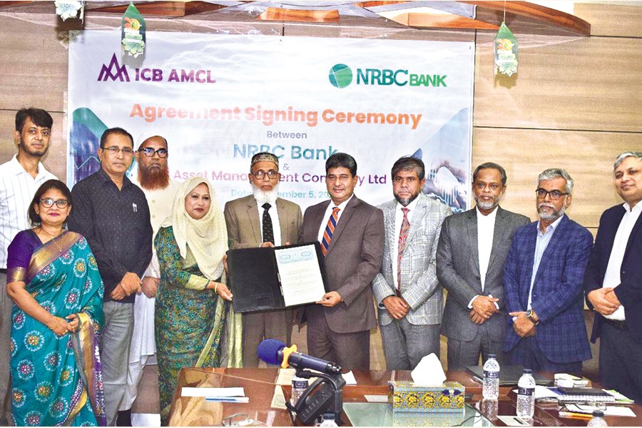 ICB Asset Management Company Limited (IAMCL) has appointed NRBC Bank as a sales representative for 15 open-end mutual funds managed by the IAMCL. CEO of IAMCL Mahmuda Akhter and Managing Director and CEO of NRBC Bank Golam Awlia signed an agreement to this end at the bank's head office on Tuesday. Managing Director of ICB Md Abul Hossain and Deputy Managing Director ATM Ahmedur Rahman were present at the signing ceremony
