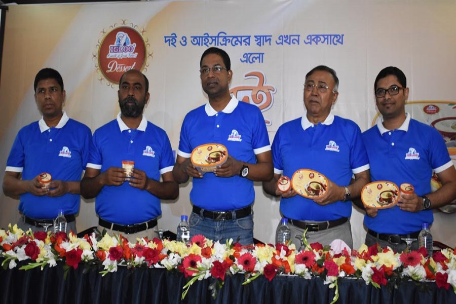 GM Kamrul Hassan, CEO of IGLOO Ice Cream and Milk unit of Abdul Monem Ltd, Khairul Basher, GM-Administration, Mazidul Haq, Sales Manager of IGLOO Ice Cream, and Mohsin Hossain, AGM-Finance and Accounts, IGLOO, are seen at the unveiling ceremony of 'IGLOO Doi Ice Cream' in the capital on Thursday.