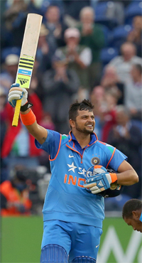 India innings: 304 for 6 (Raina 100, Dhoni 52, Rohit 52, Woakes 4-52) v England.