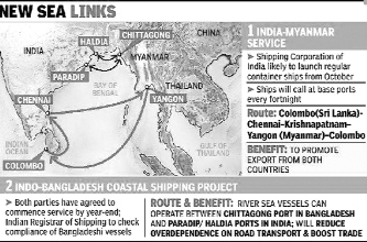 While Shipping Corporation of India (SCI) is likely to start fresh shipping lines to run container ships between India and Myanmar in October, sources said commercial trial run of vessels on India-Bangladesh coastal routes will begin in the same month. Officials said that the regular coastal shipping between Bangladesh ports and India's eastern ports such as Paradip and Haldia may commence by this year-end.